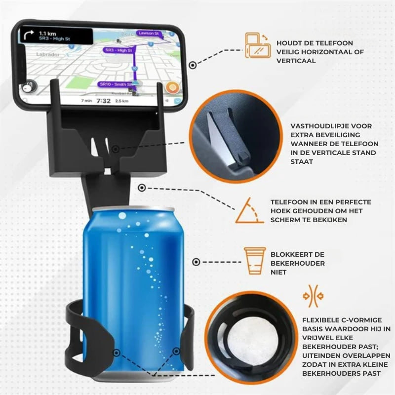 - Veelzijdig: buigt om in bekerhouders met een diameter tot 11cm te passen. Past op de meeste telefoons met of zonder hoesjes en accessoires en maakt horizontale of verticale montage mogelijk.