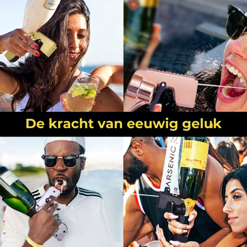 Je kunt niet alleen drinken, je kunt ook spuiten: het unieke ontwerp wordt zelfs aangedreven door koolzuur in de champagnefles, dus je hoeft niet te schudden, gewoon bedienen en spuiten.