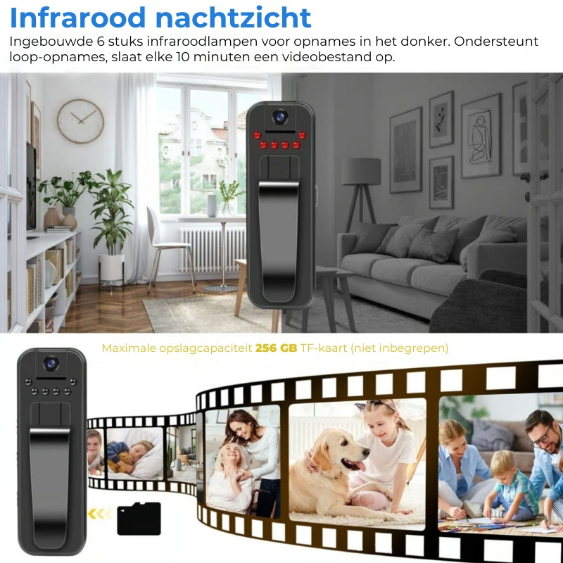 De minicamera kan gemakkelijk in een zak, aan een deur, op een ketting en dergelijke worden bevestigd. Dankzij het compacte formaat kan hij in alle omstandigheden worden gebruikt. Ideaal voor het filmen van parkeerplaatsen, huisdieren of kinderen thuis, het vastleggen van reizen of trainingen, of als beveiligingscamera.
