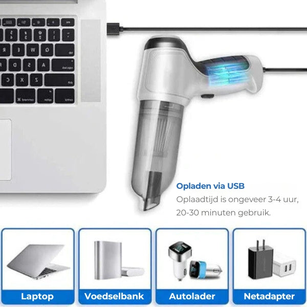Houd je auto en huis brandschoon! Onze intelligente snoerloze stofzuiger is het perfecte gereedschap om je auto en huis onderweg schoon te maken! Vuil en stof verwijderen gaat super snel en gemakkelijk!