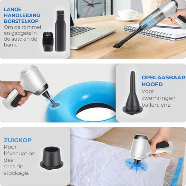 Complete reiniging voor je huis, auto en computer: Deze stofzuiger voor in de auto wordt geleverd met 4 verschillende accessoires om beter aan je schoonmaakbehoeften te voldoen, waaronder een dieptereiniger om stofzuigerzakken samen te drukken/zwemringen op te blazen/blazer en 4-in-1 plumeau.
