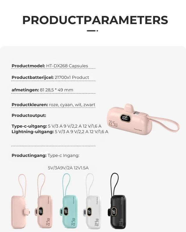 Met Powerpod™ kiest u voor vrijheid, veiligheid en gemak. Nooit meer paniek over een lege batterij, nooit meer wachten op stroom en nooit meer gedoe met meerdere opladers. Dit is de powerbank die uw leven echt gemakkelijker maakt.