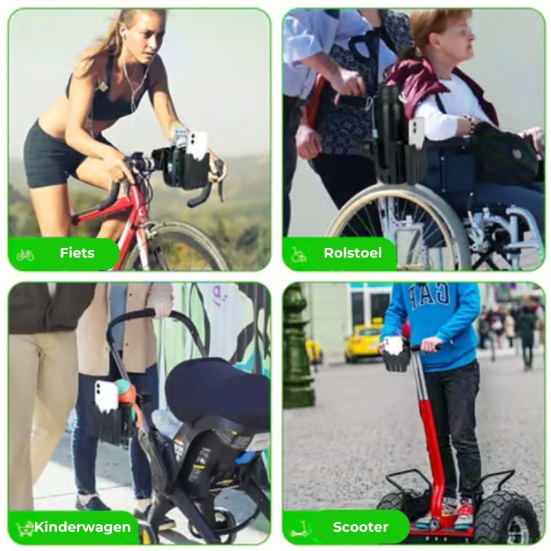- Deze op de fiets monteerbare beker- en telefoonhouder past op de meeste sturen van fietsen, rollators, rolstoelen, buggy's, scooters, bootsturen, winkelwagentjes, kajaks, ATV's, motoren, loopbanden enz.