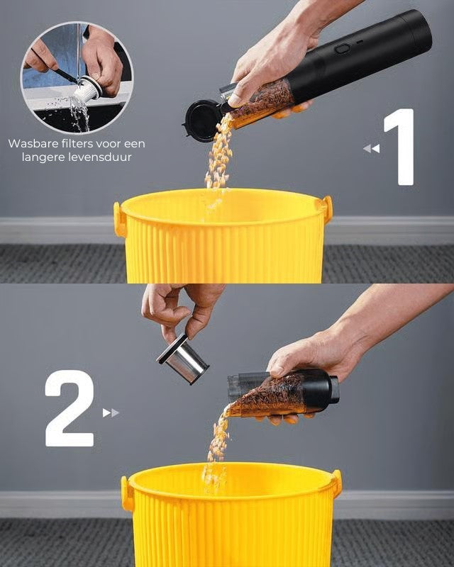 Ultra lichtgewicht en draadloos - Weegt slechts 540 g, ongeveer evenveel als een fles water. Dankzij het draadloze ontwerp kunt u met één hand gemakkelijk zand, stof en vuil in alle hoeken van de auto verwijderen. Compact en draagbaar, de bijgevoegde opbergtas is handig om in de auto op te bergen.