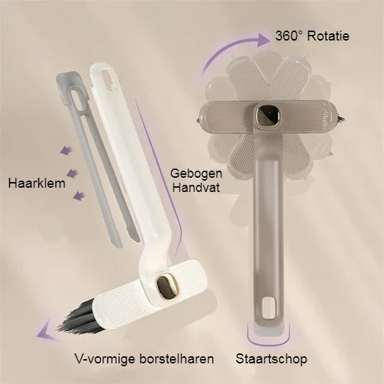 En onze drie-in-één schoonmaakborstel heeft een ingebouwde haarklem, waarmee je gemakkelijk de haren die de afvoer of het riool verstoppen kunt oppakken zonder je handen vuil te maken. Er zit ook een klein schepje aan het uiteinde om hardnekkige vlekken gemakkelijk te verwijderen.